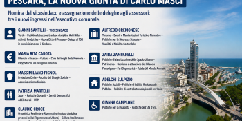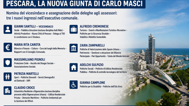Pescara - Il sindaco ridisegna l’assetto amministrativo con nuove deleghe e tre ingressi, puntando su continuità e rinnovamento per affrontare le sfide della città Il sindaco di Pescara, Carlo Masci, ha ufficializzato la nuova composizione della Giunta comunale, nominando il vicesindaco e ridefinendo l’assegnazione delle deleghe agli assessori. Un...