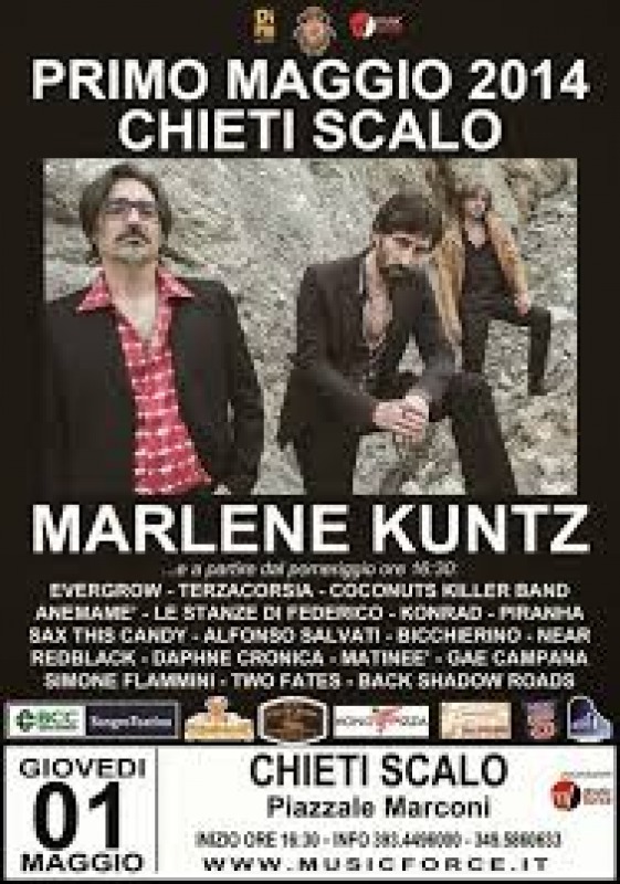 Grande successo ieri per la seconda edizione del concerto del Primo Maggio a Chieti Scalo, che ha fatto registrare oltre 10.000 persone in piazzale Marconi per il live dei Marlene Kuntz, preceduto dall'esibizione di artisti locali alla kermesse dedicata alla festa del lavoro che dopo il successo dello scorso anno il Comune di Chieti e l'associazione Music Force hanno voluto riproporre. La performance della band piemontese, che si aggiunge ai live del "Nella tua luce tour", ha regalato un'ora e mezza di grande rock, ricco di varie emozioni, compreso un piccolo battibecco tra il cantante Cristiano Godano e uno spettatore che lo ha contestato. La giornata si e' aperta con gli Evergrow, seguiti dalle Redblack e dai Pirahna. Subito dopo e' stata la volta di Daphne Cronica, Back Shadow Road, Le stanze di Federico e Near. Dopo i Sax This Candy e Gae Campana, sono saliti sul palco i Matine'e. Un breve saluto da parte del sindaco Umberto Di Primio, e poi la musica e' ripresa con Terzacorsia, Simone Flammini, Konrad, Bicchierino (tributo Rino Gaetano) e Coconuts Killer Band. Infine gli Anemame' e i Two Fates, che alle 22,45 hanno lasciato la scena ai Marlene Kuntz.