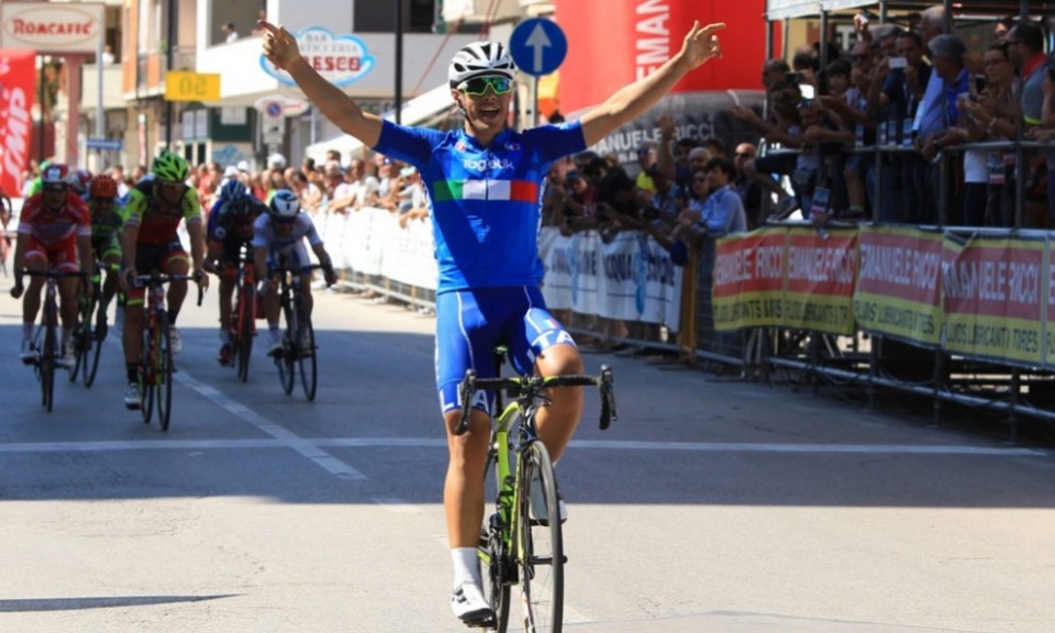 Il portacolori dell'Italia schierata dal commissario tecnico Davide Cassani, ha tagliato per primo il traguardo di Piazza Duca degli Abruzzi, precedendo in volata il romagnolo Manuel Belletti (Wilier Triestina) e il lombardo Davide Viganò (Androni Giocattoli).