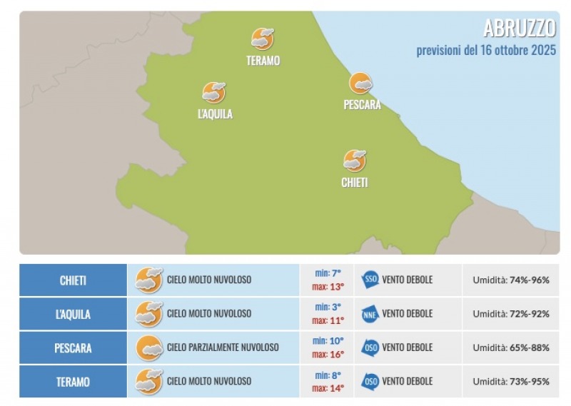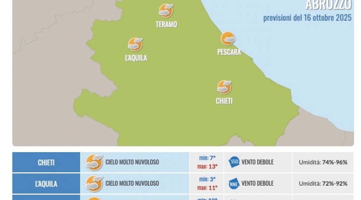 I servizi meteo regionali annunciano un peggioramento atmosferico sull’Abruzzo in vista di giovedì 16 ottobre, con la nuvolosità in aumento già nella serata, e piogge che potrebbero interessare l’intera regione, specialmente dal Chietino verso Pescara e Teramo.