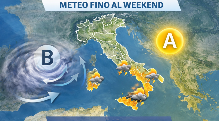 L’anticiclone domina l’Italia ma un vortice sul Mediterraneo occidentale porterà nubi e piogge su Sardegna, Sicilia e parte del Centro-Sud fino al weekend.
