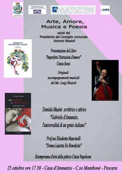 L’evento culturale avrà inizio alle ore 17,30 con il seguente svolgimento: Cinzia Rossi presenterà il suo libro “Imperfette distrazioni d’amore” e leggerà poesie da esso tratte con l’ accompagnamento musicale del M° Luigi Blasioli, Daniela Musini con la relazione “Gabriele d'Annunzio, l'universalità di un genio italiano”, Elisabetta Mancinelli tratterà su “Donna Luisetta de Benedictis, la madre tanto amata dal poeta” e Roberta Livraga leggerà brani e poesie a lei dedicati da Gabriele.