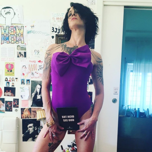 Asia Argento torna a stupire i fan mostrandosi sui social network in una posa trasgressiva e maliziosa. Stavolta l'artista dark ha postato una foto su Instagram in cui appare con indosso un costume viola di Moschino e mentre tiene in mano, all'altezza del basso ventre, un cartello con la scritta "Eat Acid See God".