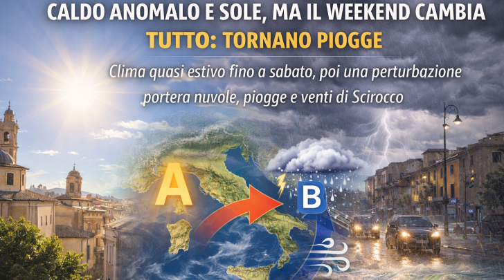 Clima quasi estivo fino a sabato sull’Italia, poi una perturbazione porterà nuvole, piogge e venti di Scirocco soprattutto al Nordovest e sulle isole.
