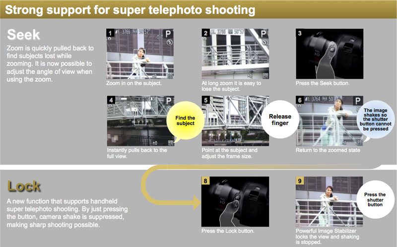 La funzione Zoom Framing Assist aiuta a rilevare e seguire al meglio un soggetto lontano quando si utilizza lo zoom alla massima estensione. Premendo il pulsante di blocco, lo stabilizzatore d'immagine mantiene il soggetto statico durante l'utilizzo dello zoom alla massima focale. Il pulsante di ricerca riduce rapidamente la percentuale di zoom della scena, consentendo di individuare nuovamente il soggetto, per poi tornare allo zoom desiderato una volta rilasciatolo.