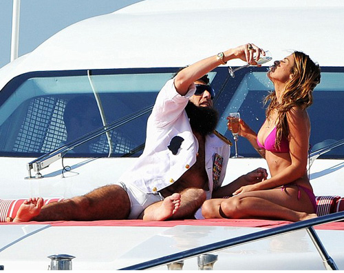 Che ci fanno Elisabetta Canalis e Sacha Baron Cohen in atteggiamenti equivoci su uno yacht ormeggiato a Cannes durante il Festival del cinema?