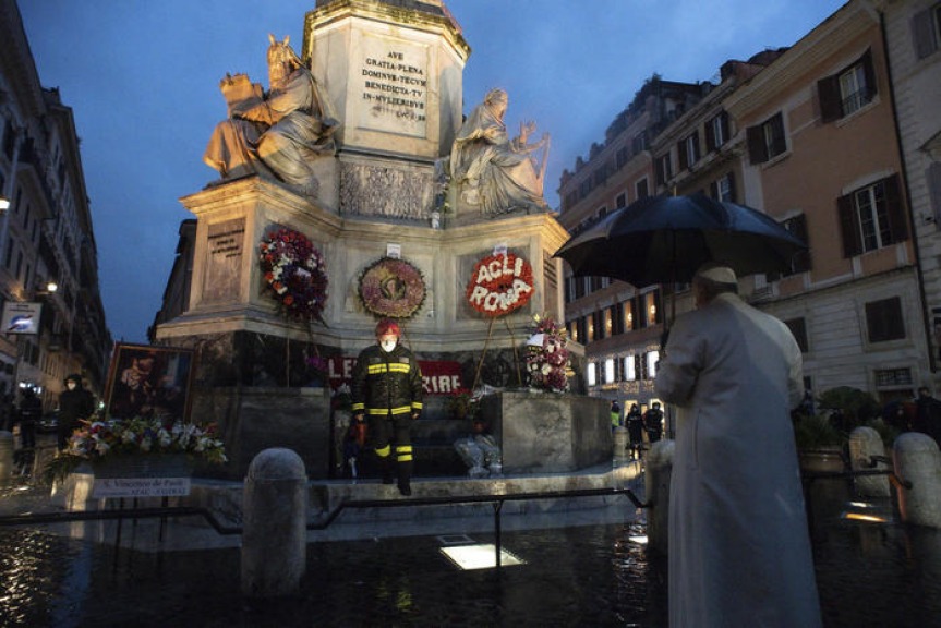 "Alle prime luci dell'alba, sotto la pioggia, ha deposto un mazzo di rose bianche alla base della colonna dove si trova la statua della Madonna e si è rivolto a Lei in preghiera, perché vegli con amore su Roma e sui suoi abitanti, affidando a Lei tutti coloro che in questa città e nel mondo sono afflitti dalla malattia e dallo scoraggiamento.