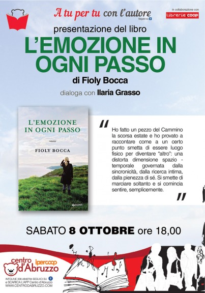 Sabato 8 ottobre alle ore 18.00 sarà graditissima ospite di "A Tu Per Tu Con L'Autore" Fioly Bocca autrice di "L'Emozione In Ogni Passo".L'Autrice dialogherà con Ilaria Grasso presso la libreria Coop del Centro D'Abruzzo a San Giovanni Teatino (Ch)