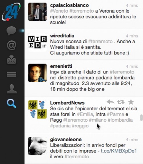 Di seguito alcuni cinguettii degli utenti, si sottolinea anche il fatto che immediatamente il #TT (trend topic o Tema Caldo) è divenuto #terremoto.