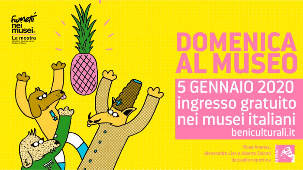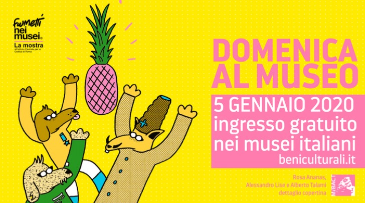 Per la prima domenica gratuita del nuovo anno, la campagna digitale del Mibact sarà dedicata alla seconda edizione di Fumetti nei Musei in mostra gratuitamente per il periodo delle festività all'Istituto della Grafica di Roma, mentre una calza speciale, scelta tra le opere conservate nel museo della pubblicità Salce di Treviso, segnerà sui social l'apertura straordinaria dei musei nel giorno della befana.