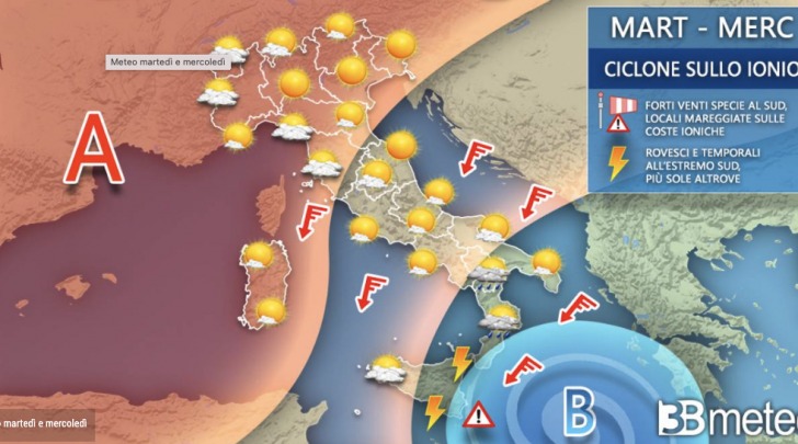 Mercoledì: L'anticiclone africano si rafforzerà ulteriormente sull'Europa centrale, determinando un clima stabile sulla maggior parte del territorio italiano. Le temperature inizieranno a risalire, soprattutto nelle regioni tirreniche e in Sardegna. Le regioni meridionali più estreme sentiranno ancora gli effetti del vortice balcanico, con instabilità e temporali in Sicilia centro-orientale e Calabria, localmente estesi a Lucania e Salento. Le temperature risaliranno soprattutto al Centro-Nord e i venti soffieranno da nordest.