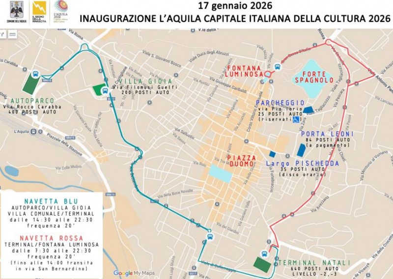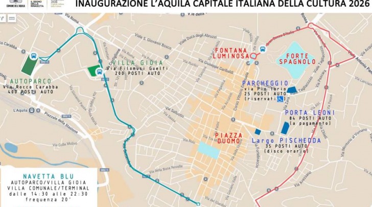 In vista dell’inaugurazione del 17 gennaio, il Comune dell’Aquila definisce divieti, chiusure stradali, navette gratuite, parcheggi dedicati, stop ai cantieri e misure speciali di safety.