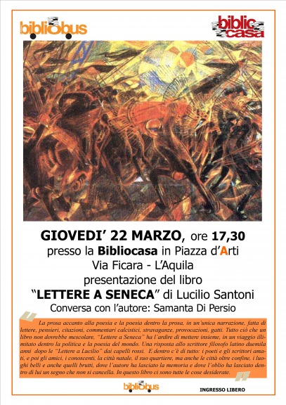 La Bibliocasa dell’Aquila (Piazza d’Arti, Via Ficara) è lieta di ospitare, giovedì 22 marzo alle ore 17,30, la presentazione del volume: Lettere a Seneca (collana ApertaMente, Edizioni Marte) di Lucilio Santoni.