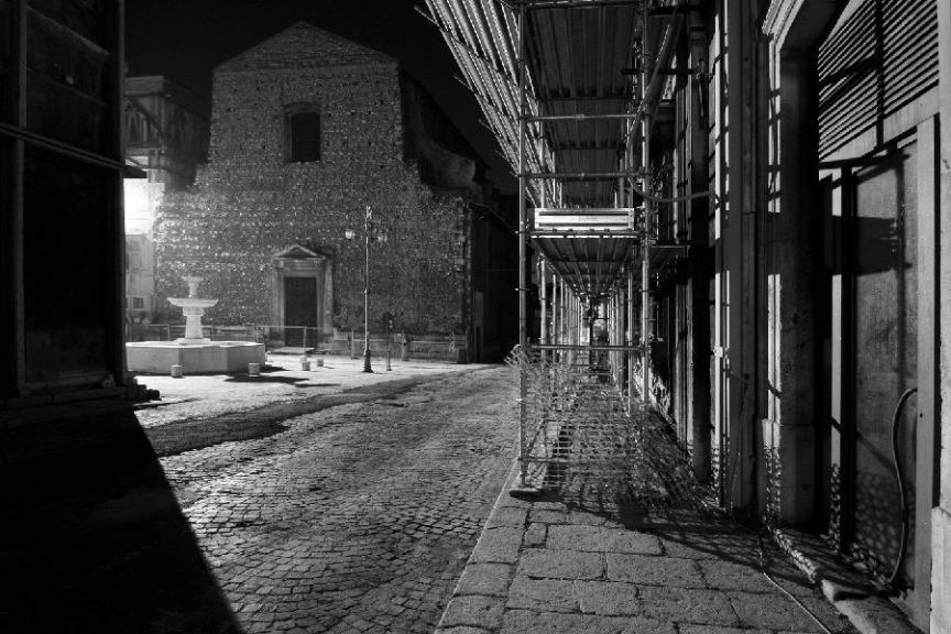 La mostra fotografica, tutta rigorosamente in bianco e nero e stampa orizzontale, potrebbe sembrare essere stata scattata tutta nella stessa lunga notte estiva. Una particolare luce contraddistingue ogni foto, mettendo in rilievo le linee geometriche dei palazzi in prospettiva, gli antichi affreschi su restauri moderni, semplici sanpietrini della pavimentazione della piazza che diventano protagonisti più di famosi mosaici col loro bianco e nero, un gioco di luce ed ombre che, a prima vista, nasconde nella sua oscurità il buio di un centro storico deserto e silenzioso. Ancora a prima vista sorprende il senso di ordine che traspare dalle foto: le strade cittadine sembrano essere state ripulite ed ordinate prima degli scatti, le macerie – dove appaiono – essere state accantonate nell’angolo, alcuni bancali perfettamente stretti ed allineati.