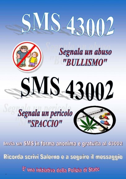 Nell'ambito delle numerose iniziative della questura di L'Aquila in favore dei giovani, nei prossimi giorni saranno distribuiti dei braccialetti riportanti la scritta "No droga, no bullismo", con l'indicazione del numero nazionale 43002, al quale e' possibile inviare via sms tutte le segnalazioni riguardanti spaccio di stupefacenti e atti di bullismo che si verificano nelle scuole.