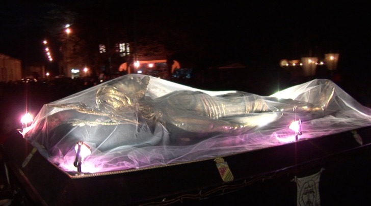 Torna la storica processione solenne del Cristo morto a L'Aquila. Venerdì 29 marzo, venerdì Santo, per le strade dell'Aquila tornerà la suggestiva processione del Cristo Morto. Il simulacro del Cristo morto in legno patinato in nero su foglia d'oro è posto su una bara coperta da drappi in velluto nero e lama d'argento; sui drappi sono ricamati, in seta, oro e argento, gli stemmi della Città e dell' Arcivescovo e simboli della Passione. Ai lati della bara quattro lampioni in rame sbalzato e lama d'argento.