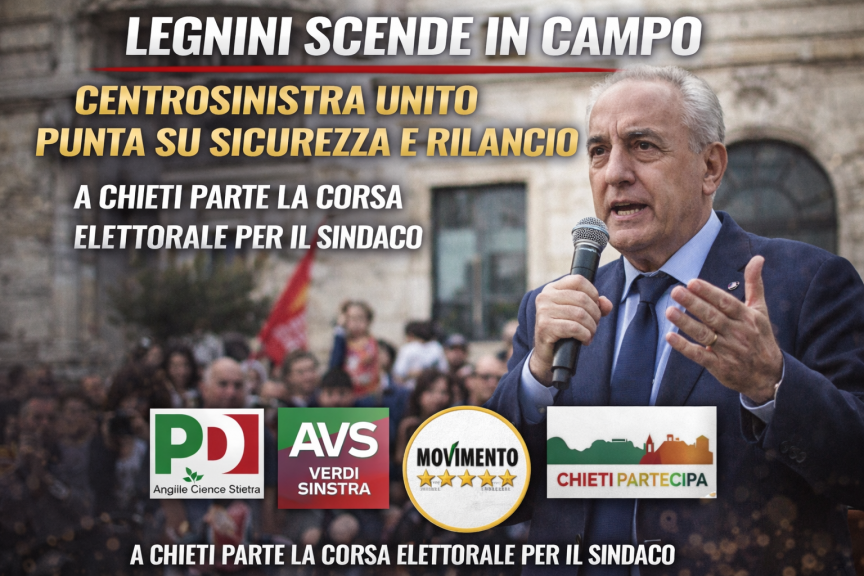 È Giovanni Legnini il candidato sindaco del centrosinistra per le prossime elezioni amministrative di Chieti. La sua candidatura è stata ufficializzata alla guida di una coalizione civica progressista che comprende Pd, Avs e M5S, con il sostegno di diverse liste.