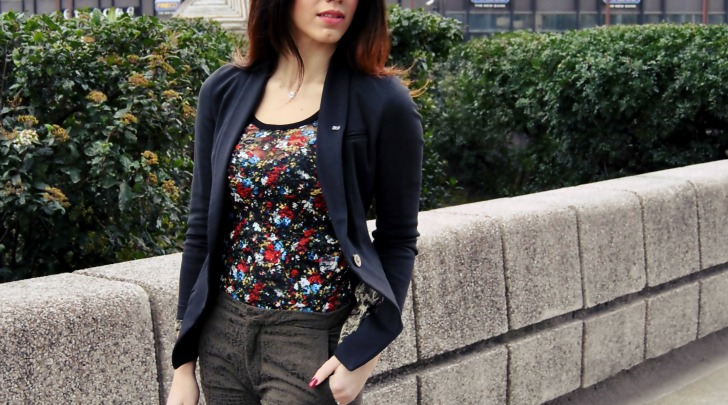 L'outfit che vi propongo oggi si compone da una giacca in felpa Zu Element che adoro portare aperta e con le maniche rivoltate perché rivestita da una bellissima fodera fantasia in diversi punti di verde. Da questa giacca è nata la voglia di abbinare qualcosa di fresco e colorato come il nuovo top proposto da Yamamay con micro-fiori colorati in sprazzi di rosso, azzurro bianco e verde. A richiamare il tema floreale e le cromie proposte un pantalone vita alta Zara in tessuto damascato colo verde militare.