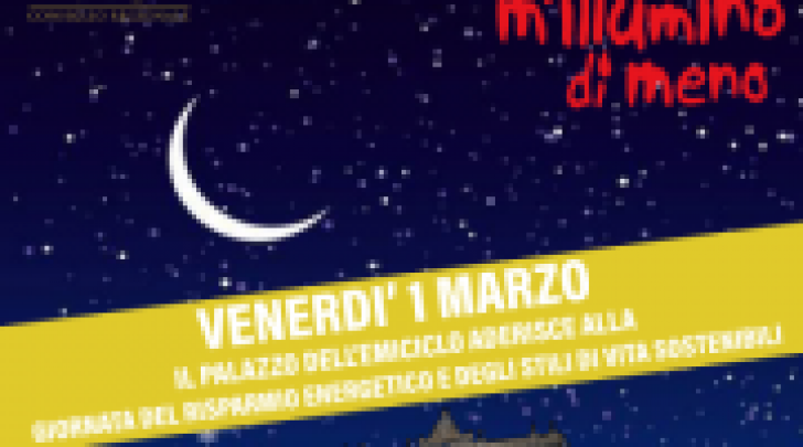 Il Consiglio regionale dell'Abruzzo aderisce alla giornata del risparmio energetico promossa dal programma di Rai Radio 2, "Caterpillar". Gli ideatori di "M'illumino di meno" propongono per venerdì 1 marzo di ridurre il consumo energetico per una notte, compiendo un gesto simbolico all'insegna della sostenibilità ambientale. L'Assemblea regionale spegnerà le luci che illuminano il colonnato dell'Emiciclo e quelle delle "torri", sede dell'attività amministrativa del Palazzo.