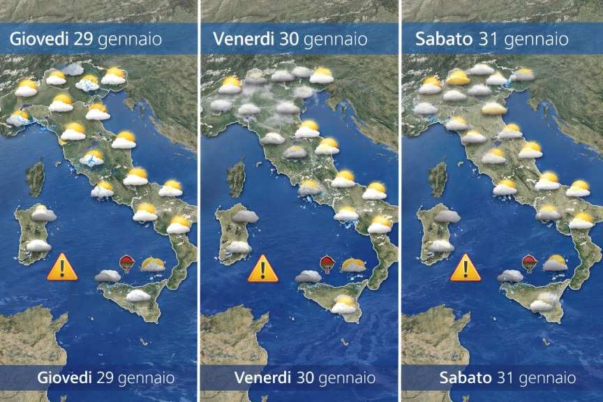 Nella giornata di giovedì, il fronte responsabile del maltempo diffuso di mercoledì si attarderà ancora su parte del Triveneto, con residue piogge e nevicate sulle Alpi orientali oltre gli 800/1000 metri, in progressiva attenuazione. Al Nordovest prevarranno invece condizioni più soleggiate. Le correnti umide occidentali continueranno a favorire variabilità sulle regioni tirreniche settentrionali, con piovaschi su Toscana, Umbria e aree interne delle Marche, mentre il versante adriatico risulterà più asciutto e luminoso.