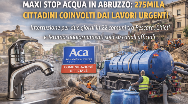 Un intervento straordinario sulla rete idrica comporterà una significativa sospensione dell’acqua potabile in gran parte del territorio abruzzese. L’Aca (Azienda comprensoriale acquedottistica) ha comunicato che nelle giornate del 13 e 14 aprile circa 275mila cittadini resteranno temporaneamente senza servizio, invitando la popolazione a seguire esclusivamente le comunicazioni ufficiali diffuse dall’ente e dai Comuni interessati.