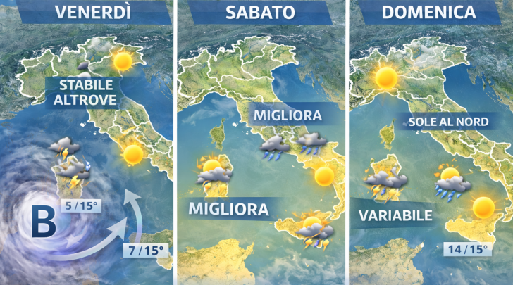 Al Sud, invece, il tempo sarà più instabile soprattutto su Sardegna e Sicilia, dove non si escludono piogge deboli o locali rovesci. Sulle altre regioni meridionali si alterneranno nubi e momenti di sole, con temperature comprese tra 13 e 17 gradi.