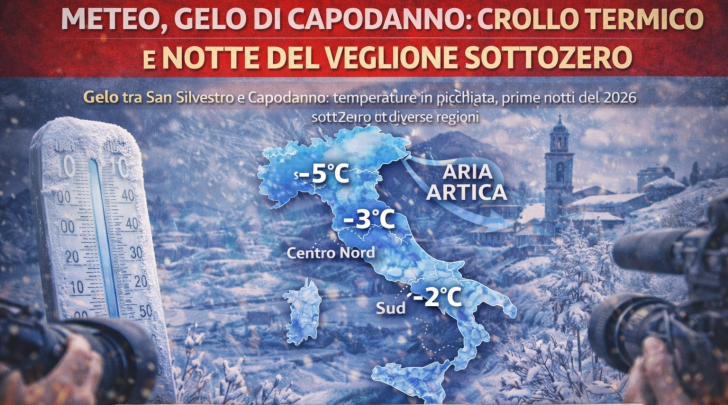 La fine dell’anno sarà segnata da un deciso tracollo delle temperature, causato dall’ingresso di aria fredda di origine artica che interesserà gran parte dell’Italia. Tra San Silvestro e Capodanno, la notte del Veglione si preannuncia particolarmente rigida, con valori sottozero su ampie aree del Paese, dalle pianure del Nord fino a settori del Centro e, localmente, anche del Sud.