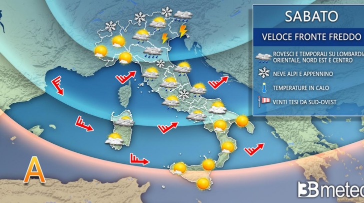 METEO SABATO. Inizio giornata ancora abbastanza soleggiato, pur con addensamenti su Alpi, specie confinali, Friuli VG, regioni tirreniche e Sardegna. Ma già nel corso del mattino aumenterà l'instabilità al Nordest e nel pomeriggio attesi piogge e rovesci su Trentino, alto Veneto e Friuli che entro sera si estenderanno a resto del Veneto, sudest Lombardia, Emilia orientale e Romagna, anche temporaleschi e localmente accompagnati da grandine e con limite neve in calo fino a 500/700m. Ampie schiarite invece al Nordovest, salvo addensamenti e nevischio sui confini alpini. Anche sulle regioni centrali tirreniche l'instabilità andrà aumentando nel corso del mattino, con piovaschi su interne toscane, laziali ed Umbria. In serata rovesci su Toscana centro-settentrionale, Umbria e Marche, in estensione a medio-alto Lazio e alto Abruzzo a fine giornata. Neve in abbassamento fin sotto i 1000m sull'Appennino centro-settentrionale. Permarranno condizioni più soleggiate al Sud e sulle isole, salvo la tendenza ad aumento della nuvolosità entro sera in Campania. Temperature in calo, specie al Centro-Nord. Venti tesi o forti occidentali, con Maestrale in Sardegna, fohn al Nordovest, Bora sul Golfo di Trieste e ancora Garbino sulle adriatiche. Mareggiate sulle coste occidentali delle isole e su tratti del Tirreno.