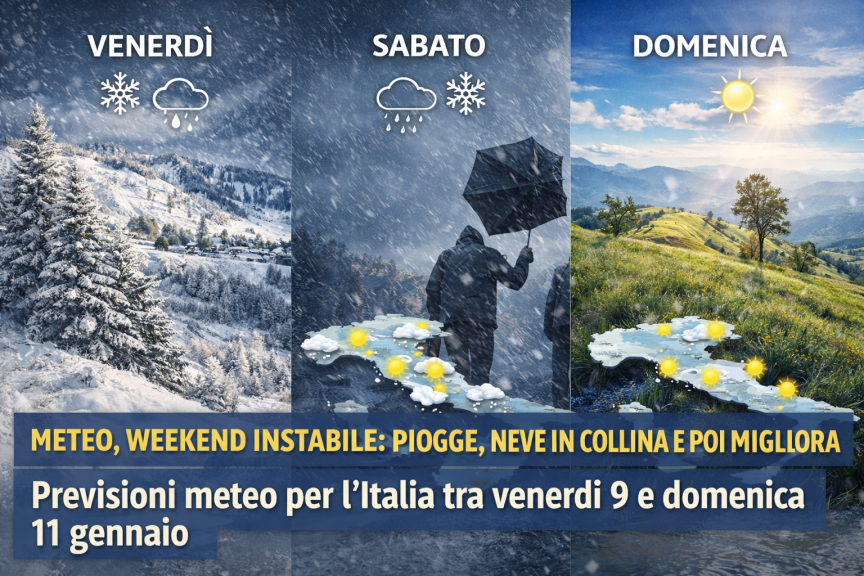 Sabato 10 gennaio vedrà un Nord stabile e soleggiato, salvo qualche addensamento sui rilievi. Al Centro persisterà una fase instabile, con piogge in pianura e neve dai 700/800 metri, specie lungo l’Appennino. Al Sud continueranno piogge e rovesci intermittenti, con quota neve in calo tra Campania e Molise. Le temperature risulteranno in diminuzione.