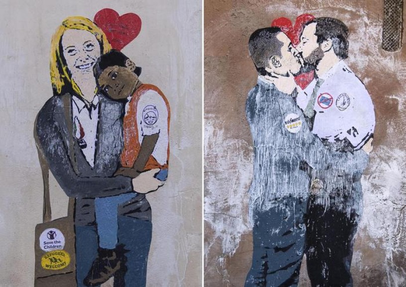 Due murales sono spuntati nella notte a Roma: uno raffigura un bacio tra Salvini e Di Maio, un altro la Meloni con un bimbo africano in braccio.