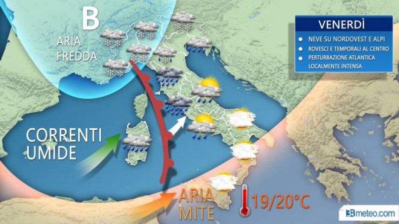 VENERDÌ: La perturbazione raggiungerà la sua massima intensità al Nord con piogge diffuse e neve fino in pianura su Piemonte, alta Lombardia ed ovest Emilia con accumuli abbondanti sulle Alpi e neve fresca anche superiore al metro oltre i 1500m su quelle Marittime. Neve inizialmente in collina al Nordest, pur con fiocchi ancora fin sui fondovalle alpini al mattino, poi in rialzo in serata su pianure e Prealpi, ma con accumuli importanti oltre i 2000m, intorno al metro e oltre su Alpi Retiche e Dolomiti. Nubi e piogge su Sardegna e tirreniche centro-settentrionali e Campania con limite neve in netto rialzo per la risalita di correnti miti meridionali.