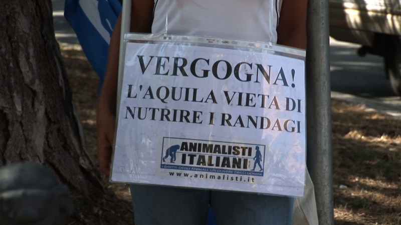 Azione di disobbedienza civile in favore degli animali, all'Aquila, di alcune decine di attivisti dell'associazione 'Animalisti italiani Onlus' e cittadini che nel parco del Castello cinquecentesco hanno dato da mangiare in strada ai randagi, sfidando l'ordinanza del 22 luglio scorso che lo vieta.