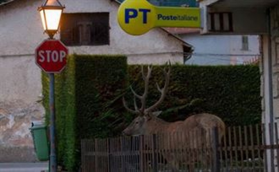 Vi è ritratto il Cervo Oreste già noto agli abitanti di Villetta Barrea in Abruzzo che sembra "fare la fila" al locale ufficio postale.