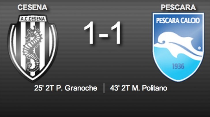 Il Cesena non riesce ad agganciare il Lanciano in testa a quota 15, arrivava da due vittorie consecutive. Il Pescara, che non vinceva dalla seconda giornata, era fermo a 6 punti e ha racimolato solo un punto nelle ultime tre partite. Esordio stagionale per Pigliacelli. Primotempo arido di emozioni e privo della benché minima sortita offensiva da parte del Pescara. Secondo tempo la musica non è cambiata. Prima azione del Pescara con Ragusa cross basso dalla sinistra, Volta libera l'area con il piattone. Cesena in avanti con Renzetti, che fa partire un cross dalla sinistra che attraversa tutta l'area di rigore. Pigliacelli buca l'uscita e mette i brividi al Pescara. 11'pt, Punizione da 30 metri di Nadarevic il tiro è debole Pigliacelli para senza difficolta. Risponde il Pescara al 12’pt, con un sinistro da fuori di Cutolo, palla che finisce tra le mani di Campagnolo. 16' pt, cross da sinistra di Rossi, Coppola recupera palla dall'altra parte del campo. 18'pt, tiro da fuori area di Coppola, Pigliacelli è attento e blocca. 23'pt, la partita è vivace. 24'pt, cross di Cutolo da destra, Consolini salta di testa e, manda via la palla. 31' pt Nadarevic sfiora il gol con un sinistro liftato dal limite. Scoppiano petardi e fumogeni nella curva del Pescara. Campagnolo si sposta dalla porta e l'arbitro ferma temporaneamente la partita. 35' pt, su calcio di punizione battuto da Cutolo dal limite, Campagnolo respinge con i pugni. Il cesena in avanti sempre con Tabanelli il suo cross da sinistra viene rinviato da Schiavi rinvia in qualche modo. Primo tempo piacevole con Cutolo protagonista per i Dannunziani. IlCesena si fa vedere in più occasioni con Nadarevic. Si riparte con il Cesena proteso in avanti. 1’st angolo di Nadarevic da destra, Pigliacelli respinge in qualche modo. 8‘ st, Cesena vicino al gol, grandissima occasione sprecata da D'Alessandro: rigore in movimento e palla sopra la traversa. Che errore! 11’ st, Palla in profondità di Viviani per Ragusa, Campagnolo esce quasi al limite dell'area e blocca.13’st, D’Alessandro proteso in attacco entra in area, ma viene messo giù da Pigliacelli, l’arbitro concede il rigore. Cambio obbligato per Marino: Belardi prende il posto di Viviani. Belardi para il rigore battuto centralmente da Succi. 17’st, Nadarevic si ritrova il pallone tra i piedi, però cicca il pallone. Sfuma un'altra azione per il Cesena. 25’st, Cesena in vantaggio. Granoche realizza sugli sviluppi di un calcio di punizione battuto da De Feudis per la testa di Tabanelli e l'attaccante bianconero da due passi non sbaglia. Difesa del Pescara in bambola. 30’ st,Serpentina di Nielsen al limite, Volta esce palla al piede e fa ripartire l'azione. 37’ st, grande azione di contropiede avviata da Coppola. Poi destro di D'Alessandro, Schiavi s'immola e allontana con il corpo. 43’st’ Cesena-Pescara 1 - 1: Politano beffa Campagnolo con un tiro cross dalla sinistra da fuori area, alla fine della gara lo stesso attaccante ammette con sincerità che era un traversone. Ma sono felice. Consolini sfiora il gol vittoria con un tiro da fuori: pallone a lato, nei minuti di recupero. Cesena-Pescara 1-1: Finale. Politano acciuffa all'43’st, i padroni di casa, passati in vantaggio con Granoche al 70'. Pescara in dieci dal 12’ st: rosso al portiere Pigliacelli. Succi tira addosso a Berardi il rigore. Il Cesena sale a 13 punti, il Pescara si salva e va a 7. I romagnoli se la vedranno sabato pomeriggio contro il Siena in casa. Il Delfino in casa contro lo Spezia dell’ex Stroppa. Come al solito la difesa ha ancora dei problemi. Problemi di centrocampo, solo Cutolo in avanti ha fatto cose egregie. Cero così non va, un pari insperato ma gradito, ma la strada è tutta in salita e tortuosa.