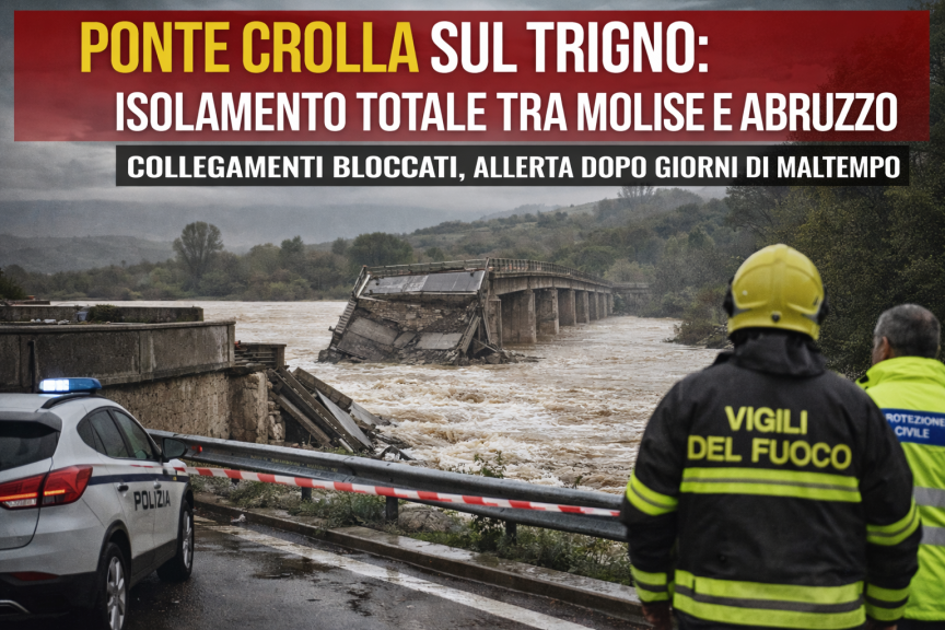 Il maltempo persistente che sta interessando il Centro-Sud ha provocato il crollo del ponte sul fiume Trigno lungo la statale 16 Adriatica, nel territorio di Montenero di Bisaccia, in Molise. La struttura era già sotto osservazione nelle ore precedenti, quando le autorità avevano disposto la chiusura preventiva della strada a causa dell’ingrossamento del fiume, poi sfociato in esondazione.