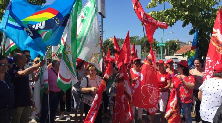 Sit-in di protesta questa mattina davanti al Cup dell'ospedale di Pescara dei lavoratori delle cooperative che forniscono servizi mensa e pulizia negli ospedali, case circondariali, scuole e uffici pubblici.