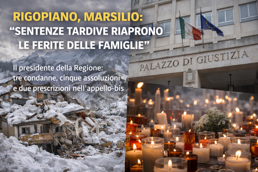 La nuova pronuncia giudiziaria sulla tragedia di Rigopiano riporta al centro dell’attenzione una delle pagine più drammatiche per l’Abruzzo. A margine di una conferenza stampa, il presidente della Regione, Marco Marsilio, ha commentato l’esito del processo d’appello-bis celebrato a Perugia, conclusosi con tre condanne, cinque assoluzioni e due prescrizioni.