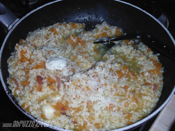 7- Quando il riso è cotto, lo lascio un po' umido e aggiungo lo stracchino, giro per farlo sciogliere. Lo servo dopo qualche minuto, quando lo stracchino è diventato cremoso. Il parmigiano copre un po' il sapore della zucca, io preferisco non metterlo.
