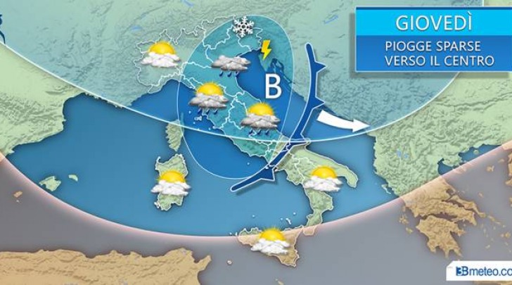Una perturbazione provenuta dalla Francia ha raggiunto l'Italia nel corso di mercoledì a partire dal Nordovest e con il passare delle ore sfilerà verso sudest. Nella giornata di giovedì sposterà il proprio raggio d'azione sulle regioni nordorientali e su parte di quelle centrali, dove distribuirà piogge e rovesci sparsi.