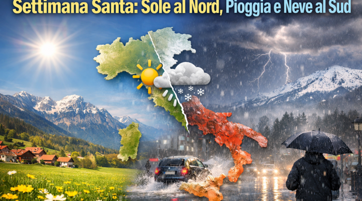 La Settimana Santa si apre con uno scenario meteorologico nettamente diviso: tempo stabile e soleggiato al Nord, mentre il Centro-Sud sarà interessato da una fase di maltempo diffuso, accompagnata da piogge, temporali e nevicate anche a quote collinari. Una configurazione determinata dall’ingresso di correnti fredde che continueranno a influenzare soprattutto il versante adriatico e le regioni meridionali.