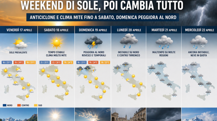 Già da venerdì 17 aprile si osserva una situazione nel complesso favorevole: al Nord prevalgono condizioni di stabilità, con qualche lieve variabilità sulle aree alpine e tra Piemonte e Lombardia. Al Centro giornata luminosa, disturbata solo da innocui addensamenti lungo l’Appennino, mentre al Sud il tempo resta in prevalenza sereno, con qualche nube pomeridiana tra Calabria e Campania. Le temperature risultano comprese tra 18 e 24 gradi.