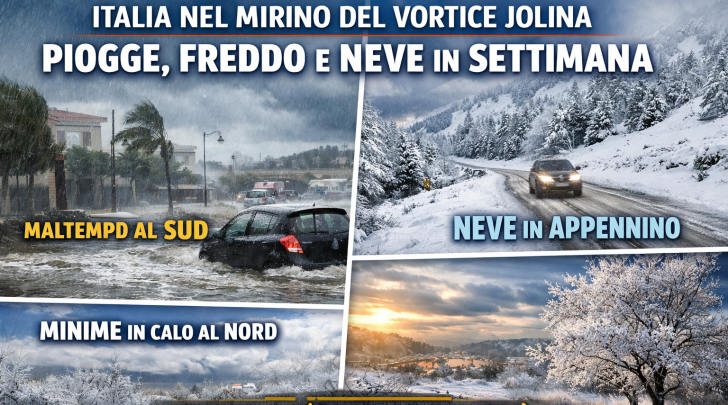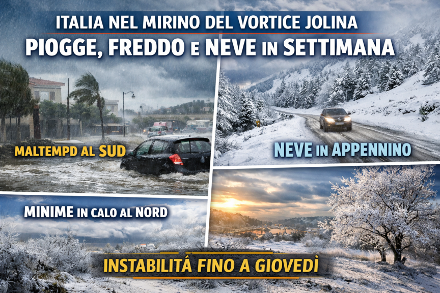 La nuova settimana si apre all’insegna di una persistente instabilità atmosferica legata al vortice Jolina, destinato a influenzare il quadro meteorologico italiano almeno fino a giovedì. Le condizioni risulteranno variabili, con piogge, rovesci e un generale calo delle temperature, soprattutto al Sud e su parte del Centro.