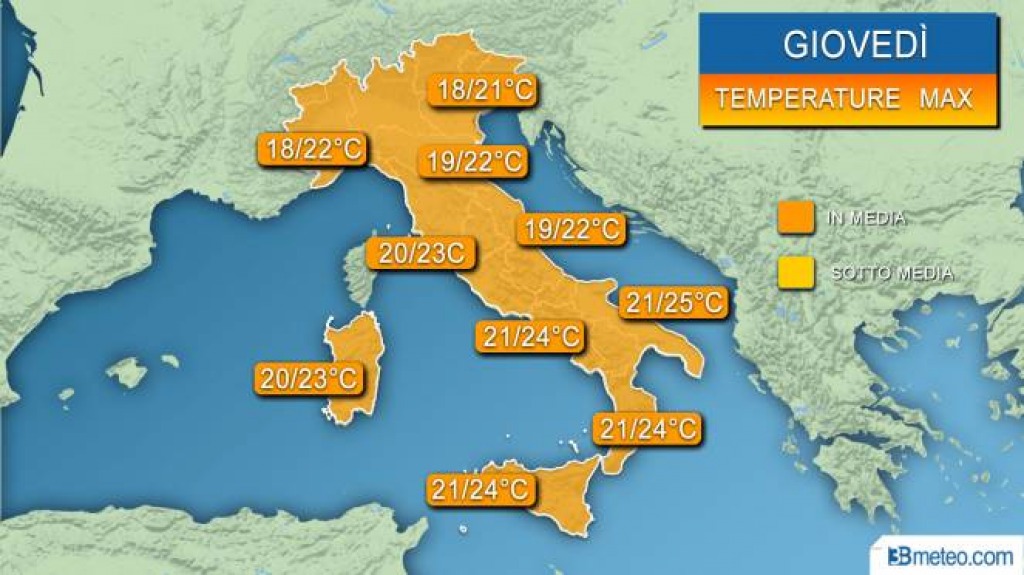 Il transito di un leggero impulso instabile non influisce in modo particolare sulle temperature che restano poco variate rispetto al mercoledì. Un aumento interesserà l'estremo Sud della Penisola e il basso Adriatico, tanto che sul Tavoliere delle Puglie si potranno toccare anche i 26°C. Altrove attese massime sui 20/22°C al Nord, 21/24°C al Centro, 22/25°C su basso Tirreno ed isole.