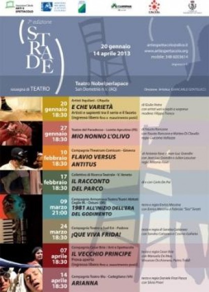 Prenderà il via domenica 20 gennaio, presso il Teatro Nobelperlapace di San Demetrio ne' Vestini (AQ) la 7a edizione della rassegna "Strade", ideata da Giancarlo Gentilucci, organizzata e promossa da Arti e Spettacolo.