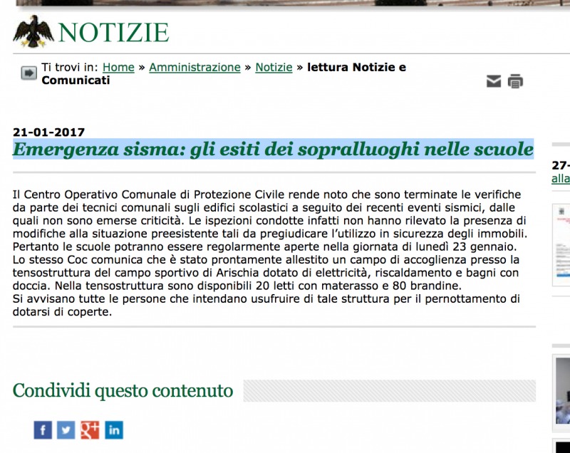 Una nota a margine... il comune è sicuro che si possa gestire una scossa, seppur lieve, con i bambini nelle scuole? È sicuro il comune che il caos generato dai genitori che, tutti insieme, accorrono nei plessi scolastici sia sostenibile? È sicuro che, in quella situazione, tutti sappiano cosa fare (dai genitori agli operatori del traffico)?
