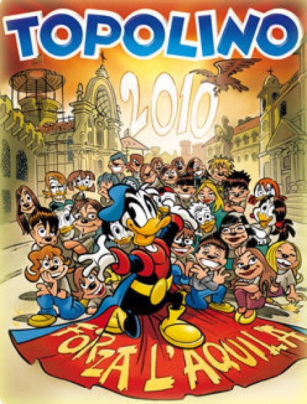 E questa esperienza è trasposta sulle pagine del numero 2823 di Topolino, che in copertina, come mostra l'immagine, lancia un incitamento ai tenaci amici dell'Abruzzo, al quale ci uniamo anche noi: "Forza L'Aquila".