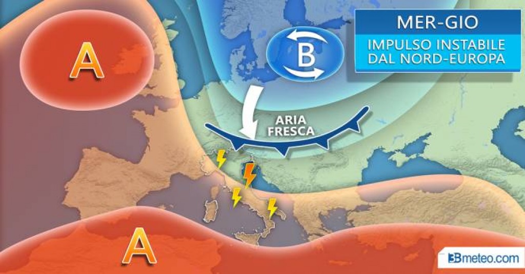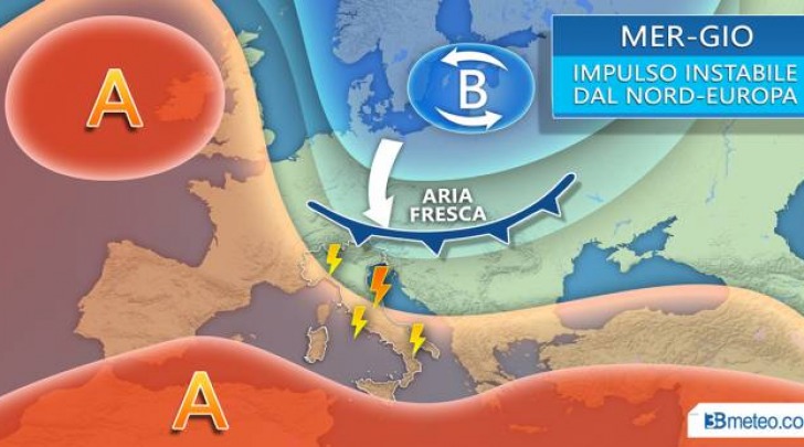 L'alta pressione che favorisce tempo stabile e clima estivo ad inizio settimana non avrà lunga vita e già dalle primissime ore di mercoledì verrà attaccata da un fronte freddo in discesa dal Nord Europa che attraverserà l'Italia da nord a sud determinando un deciso calo delle temperature a suon di piogge e temporali, più intensi sulle regioni del versante adriatico.