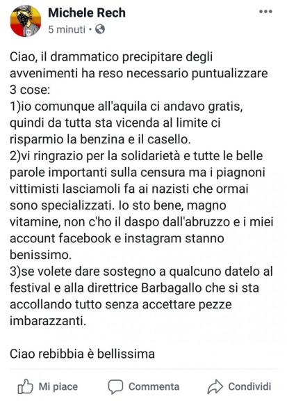 Poi ringrazia i tanti che gli hanno manifestato solidarietà, ma aggiunge: "I piagnoni vittimisti lasciamoli fa ai nazisti che ormai sono specializzati". Poi ironizza sulla cancellazione degli account social di Casapound e Forza Nuova: "Io sto bene, magno vitamine, non c'ho il daspo dall'Abruzzo e i miei account Facebook e Instagram stanno benissimo".